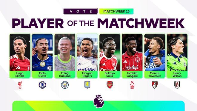 北京时间12月16日,英超官方公布了联赛第16轮最佳球员候选名单,这8名球员为埃基蒂克、古斯托、哈兰德、罗杰斯、萨卡、桑加雷、塔韦尼耶、哈里-威尔逊。